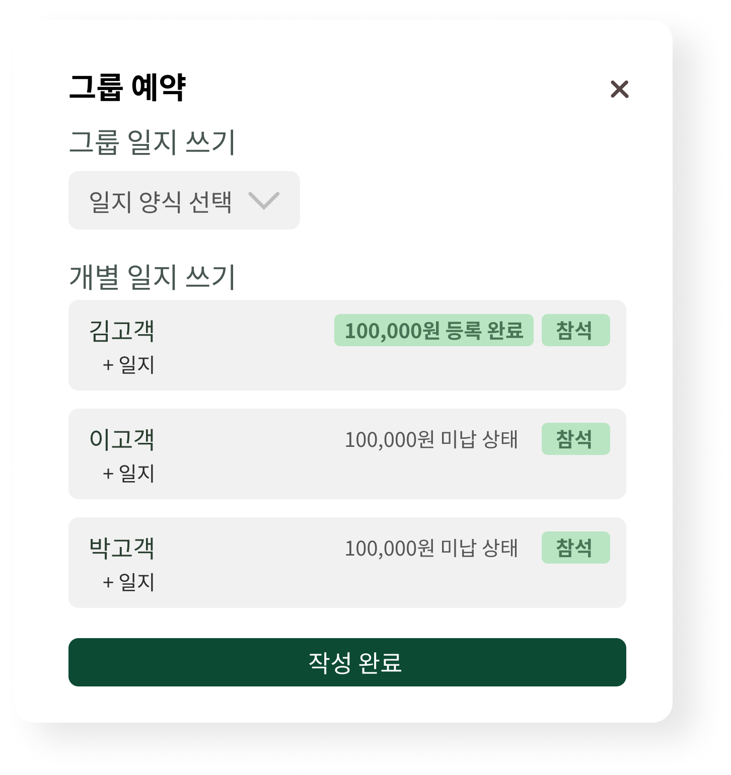 같은 내담자가 개인 상담도 받고, 그룹에도 참여하고 있더라도 회기, 기록, 정산이 서로 뒤섞이지 않고 해당 내담자 기준으로 누적 연결되어 관리됩니다.